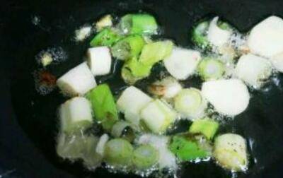 3、锅中放油,油热后放入葱花和蒜片爆香。