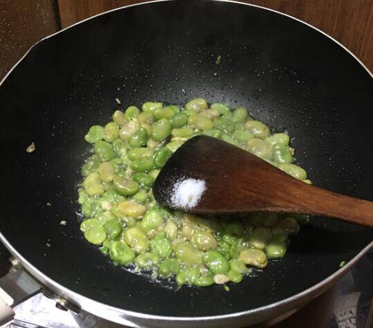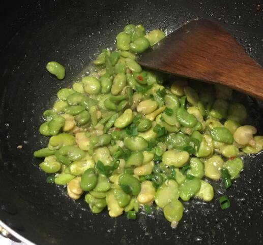 3、锅中加入食用油,大火烧热,下入蒜末和葱白煸出香味,下入蚕豆翻炒几下,调入盐和鸡精,加入少许清水,加入少许辣椒酱。
