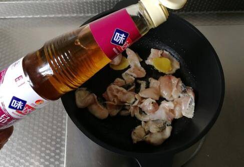 2、无水不粘锅,倒入玉米油。下姜片,开大火将油烧热,倒入腌制好的鱼片,迅速翻炒。