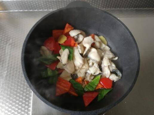 7、然后倒入之前炒好的鱼片一起翻炒,1分钟左右。