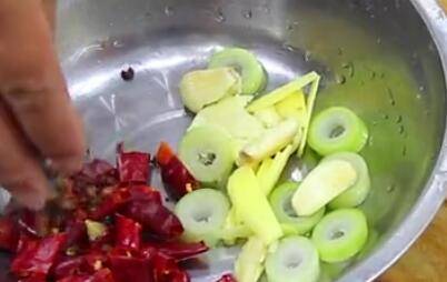 2、腊肉控干水分后切片,大葱白切圈,大蒜拍扁,生姜切片后与葱、蒜放在一起,抓入干辣椒20g、花椒10g;