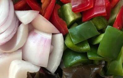 4、腌制腰花的时候处理配料;青椒、红椒、洋葱、木耳切成小块。