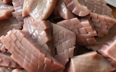 2、光面朝上,切出腰花;下刀间隔均匀,深浅为不超过腰子厚度的2/3;切成小块。