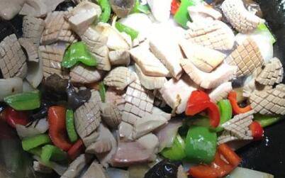 7、油锅烧热,放入蒜瓣、姜丝炒香再放入葱丝;加入洋葱,翻炒;加入青椒、红椒、黑木耳翻炒;放入腰花,翻炒。
