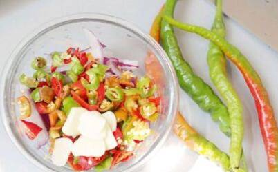 2、辣椒尽量剁的碎一些。选择这种线椒又辣又香;葱白、葱绿一起切碎(需要用一整根大蒜)。