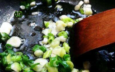 4、热锅凉油炒香葱和蒜;再加入洋葱丝和剁椒继续翻炒,洋葱略软即可;这时加入两勺豆瓣酱,快速翻炒。