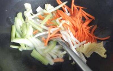 2、锅中加油,放胡萝卜、白菜根翻炒。