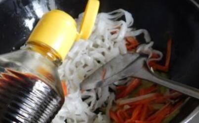 最佳答案:材料:凉皮200g、白菜50g、胡萝卜1根、生抽5g、盐4g。白菜、胡萝卜切丝,切白菜叶。锅中加油,放胡萝卜、白菜根翻炒。加入凉皮,炒均匀后加生抽,炒至凉皮透明,加入白菜叶。加盐,翻炒均匀后加入鸡精,即可装盘。