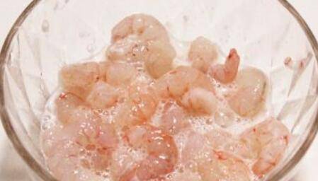 2、黄瓜切丁、香肠切丁、鸡蛋打散、香葱切碎备用。虾仁中加半只蛋清、一小勺淀粉抓均后腌制10分钟备用。