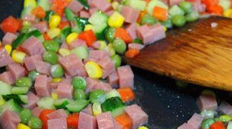 5、锅中加少许油,油热后将玉米、青豆、胡萝卜、黄瓜、香肠倒入锅中,加入少许盐煸炒匀后盛出备用。
