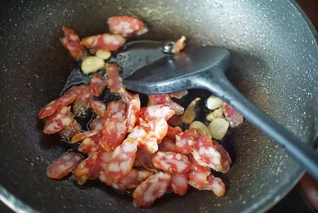 3、然后放入切片的腊肠翻炒至腊肠变得通透。