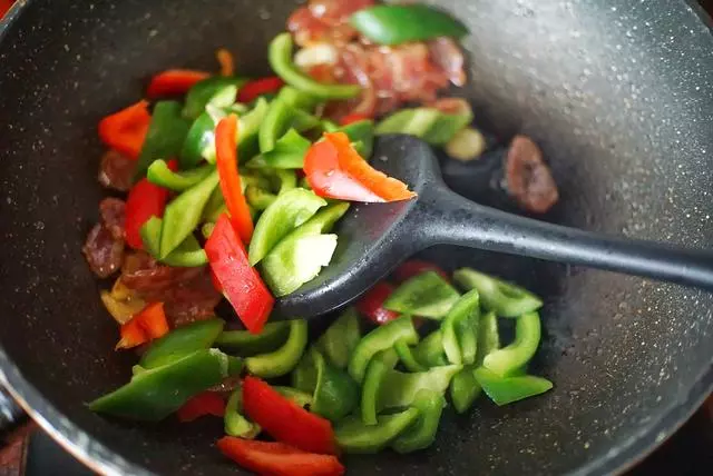 4、再倒入切块的青红尖椒翻炒均匀。