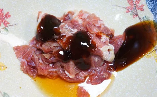 2、加少许料酒和蚝油,搅拌均匀。