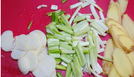 7、切葱姜蒜,小葱只用葱白部分。