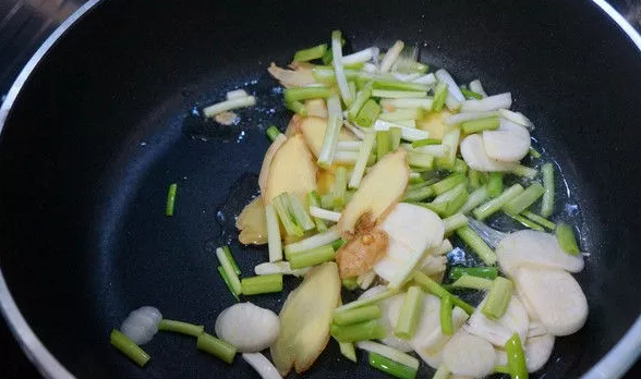 9、先把葱姜蒜放进去煸炒。