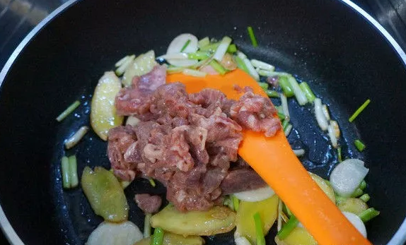 10、出香味之后加入腌制好的牛肉片,一起翻炒到变色。