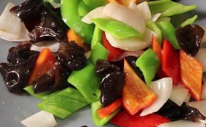 6、锅中倒少量油,将青红椒和洋葱翻炒片刻,再加入泡发的木耳和少许盐翻炒,盛出备用;