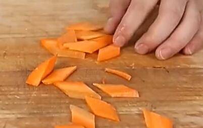 4、首先把胡萝卜平放在案板上,用刀将胡萝卜切成段,然后四周切一下成方形。如果长根萝卜不好切方,可以切段后再切方,在侧边切片,这样就把胡萝卜切成了棱形片。