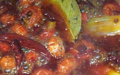 4、热锅凉油(油比平时炒菜多一些),放入豆瓣酱,小火炒出红油,然后放入花椒、八角、香叶、干红辣椒、葱姜蒜炒出香味,后放入虾尾翻炒两分钟;