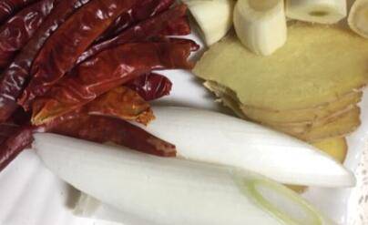 3、葱切段,姜切片,蒜,干红辣椒,花椒,八角,香叶,豆瓣酱,白糖等调味料备好;