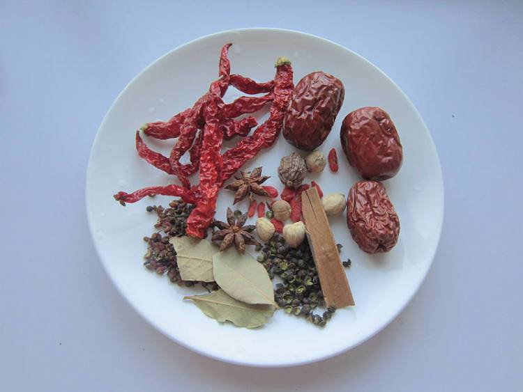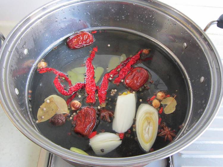 3、煮锅加水,加花椒粒、胡椒粒、麻椒粒、八角、香叶、草果、白芷、党参、桂皮、大葱、辣椒大火烧开,煮到香味出来。