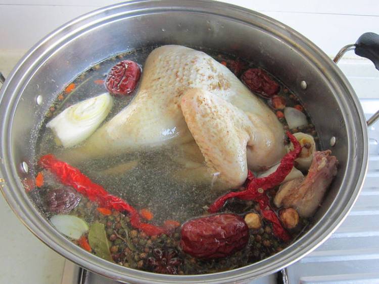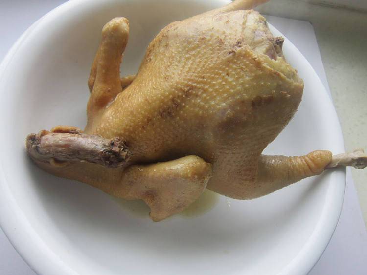 5、转小火煨煮到土鸡九成熟后,捞起彻底凉透。