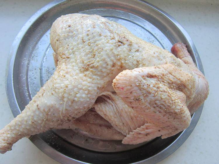 1、把土鸡收拾干净,洗净,用盐、花椒粉抹在土鸡全身,腌制20分钟。