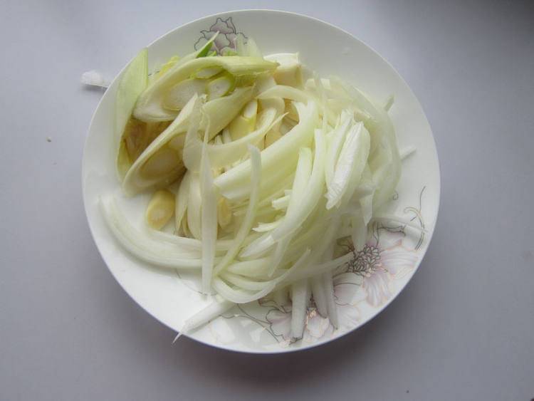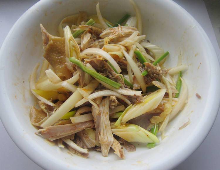 9、鸡凉了以后,用手撕出鸡肉,加洋葱丝、大葱、鸡汤汁、椒麻油、麻椒红油,一起拌均匀即可。