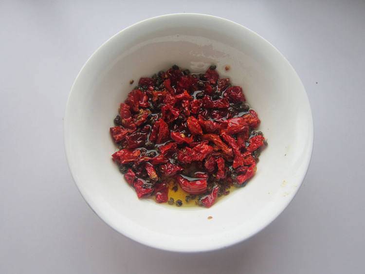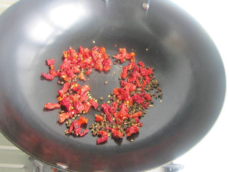 6、热锅小火把辣椒、麻椒,花椒粒炒出香味捞出装碗加少许盐。