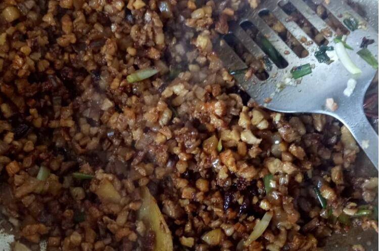 6、下肉丁,加料酒翻炒至出油。