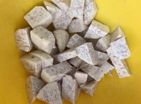 5、放入鸭条、芋头条、姜、蒜、绍酒、盐、酱油烧至汁浓鸭软。