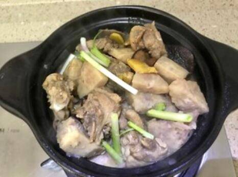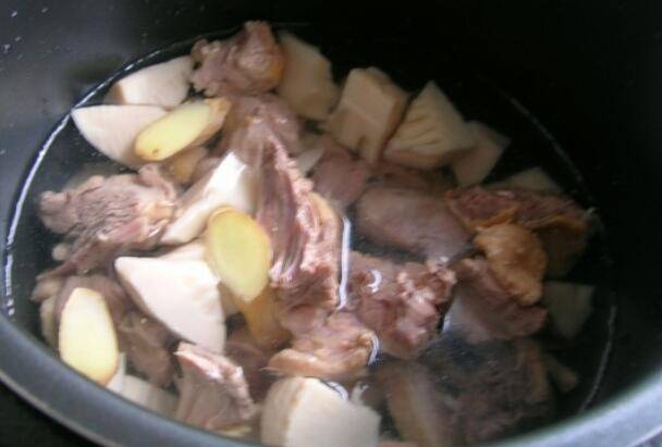 3、用上强大的电压力锅,将焯烫过的材料和姜片一起放入,加入少许料酒和适量清水,按煲汤键即可。
