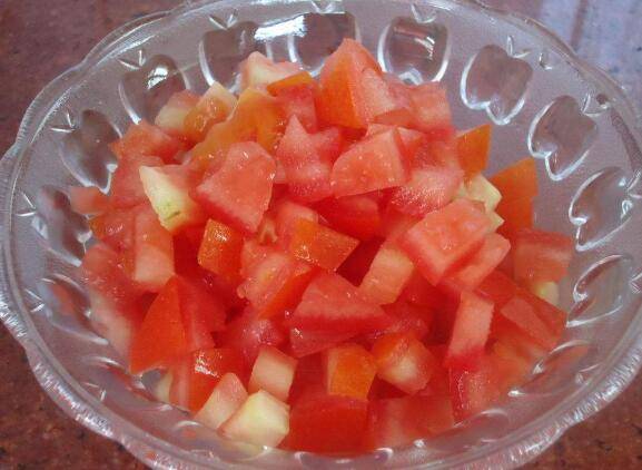 1、将西红柿清洗干净,切成小块,装入盘中待用。