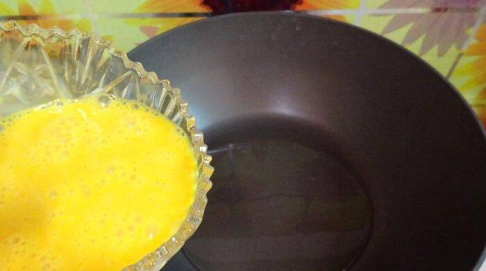 2、热锅放油烧热,将打撒的鸡蛋液倒入锅中。