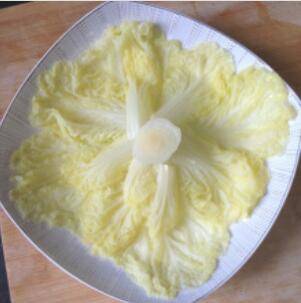 2、切头、摆盘:娃娃菜切头,娃娃菜从大片开始往盘底摆盘,直到摆完为止