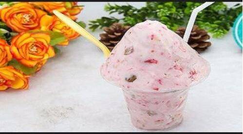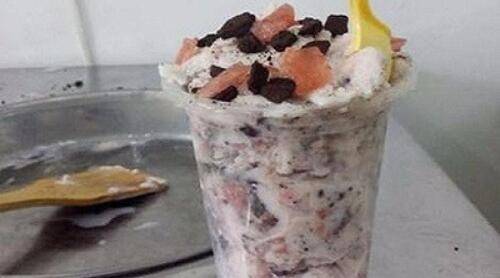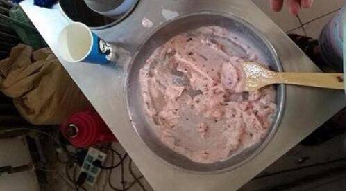 3、用两个铲子快速搅拌牛奶、迅速地将草莓切碎,并不停搅拌牛奶草莓,让牛奶草莓酱少接触炒奶果机,以防结冰。