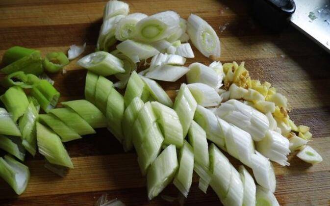 3、把干辣椒剪去头尾,再把干辣椒煎成段,辣椒籽不要,黄瓜切成丁,葱切葱花,姜切末,大蒜切片,下面来调汁,宫保鸡丁是小荔枝口,不是大酸大甜,取一小碗,加入生抽1汤匙、老抽半汤匙、白糖1.5汤匙、香醋2汤匙、料酒半汤匙、白胡椒粉1茶匙、淀粉1汤匙、少许盐,3-4勺清水,搅拌均匀,这样汁就调好了。