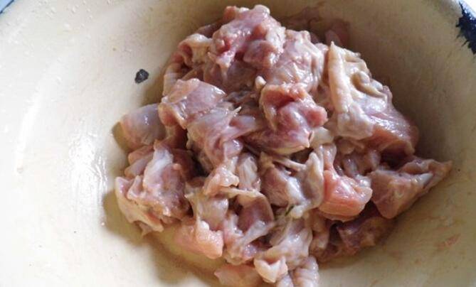 2、将鸡脯肉用刀背拍一下,把鸡肉拍松,这样鸡肉能更好的入味,再把鸡肉切成丁,加入白胡椒粉,料酒,少许盐,抓匀,再加入1汤匙淀粉抓匀,加入1勺油拌匀,腌制5-10分钟,鸡丁先腌制入味,可以去腥味,用淀粉上浆,锁住水分,炒之前加上少许油拌匀,这样才能使得鸡块更嫩滑,而且炒制时也不容易粘锅。