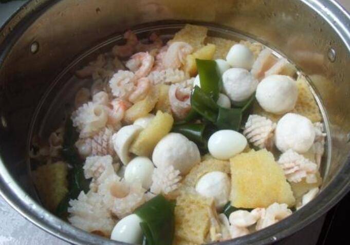 1、鱼丸、甜不辣放锅中焯水30秒,虾、鱿鱼圈焯水30秒,土豆、藕焯水。