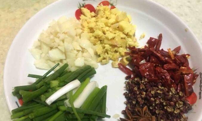 2、起锅烧油,放蒜、花椒、豆瓣酱、辣椒,炒香后加水。