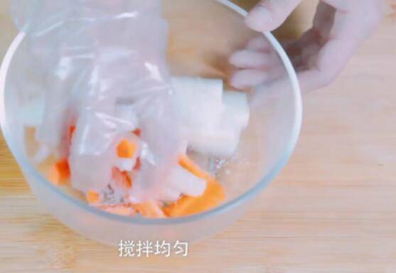 最佳答案:做法:姜、干辣椒切段,将白、胡萝卜切条。碗中放入适量的盐,将切好的萝卜放入碗中,搅拌均匀,加入姜、干辣椒,加入适量白醋,腌泡一段时间即可。