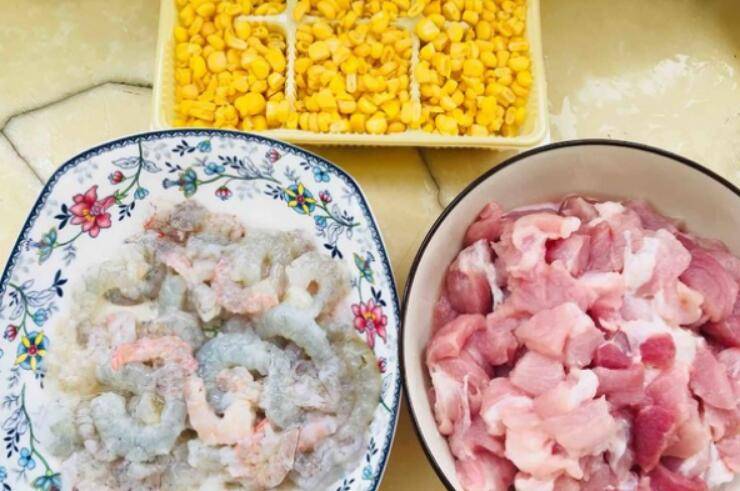 1、准备好水果玉米、猪肉、鲜虾去壳去虾线。
