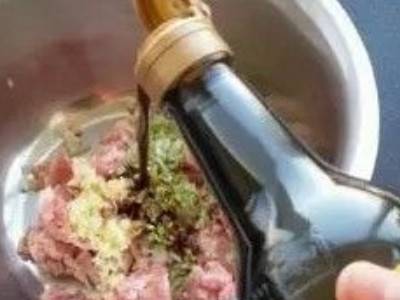 在肉馅中放葱、姜末,加入老抽,搅拌均匀。