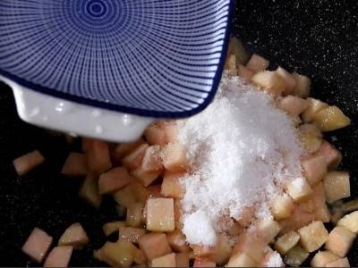 将桃丁放入锅中,加入白糖、清水,小火慢熬。等桃子变软,汤汁变浓稠后,关火晾凉。