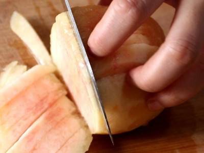 水蜜桃洗净,用刀背将皮剥掉,把桃子切成小丁。