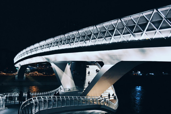 成都网红桥的形状和莫比乌斯环的形状相似,是我国第一座“莫比乌斯环”异形拱桥,分为上下两层,其中上层坡度较缓,主要是自行车通道,下层设计有环绕式台阶,让市民欣赏最美的夜景。