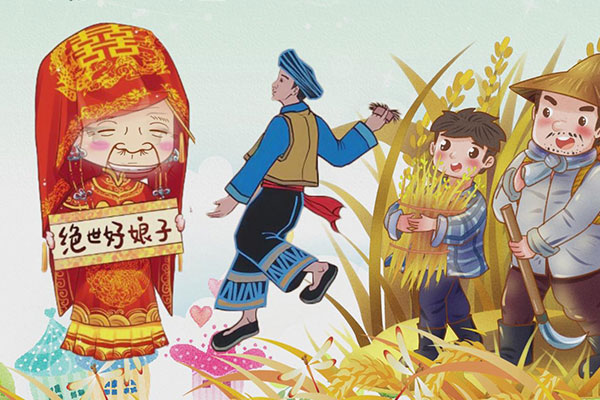 这支民歌起源于南疆的乡土游戏,秋收时,南疆的人们在麦场休息,一位老汉会身着妇女服饰,盖上盖头,作出娇羞忸怩状。另一位青年在他的身旁唱跳,最后掀起盖头,却见一位白发老汉。众人哄堂大笑,继续劳作。