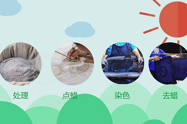 蜡染时,需要进行处理、点蜡、染色和去蜡四步。先将布用草木灰漂洗干净,把布磨平,再用铜刀沾蜡作画,在白布上画出图案,然后把蜡片浸泡在颜料里,最后清洗。