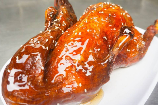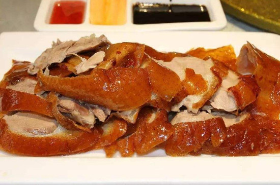 制作甜皮鸭需要先将五香粉、盐和白酒涂抹在洗净的鸭子内外,放入盆中冷藏腌制12小时后,锅内放油、白糖炒出糖色,加入一碗清水后,再加入4碗卤水和鸭子,小火卤煮1小时后,将烧热的油淋在鸭子身上,直到鸭皮变酥成棕红色,再刷上一层麦芽糖水即可。