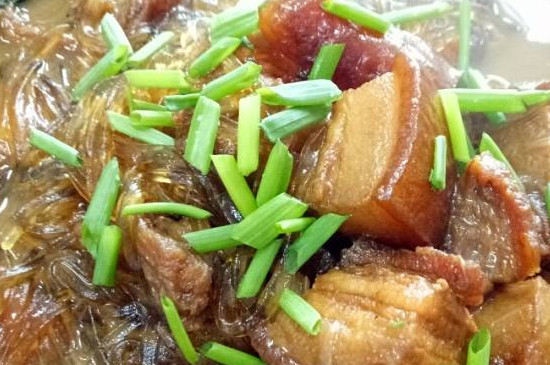 将猪肉用火去毛,然后放在温水里清洗干净,洗完后切成肉块拌上酱油腌制。将热锅烧油,烧开后丢入猪肉开始炸至颜色变成金黄色后加入粉条,根据个人口味添加完佐料后,盖上盖子转小火炖烂,30分钟后即可出锅。